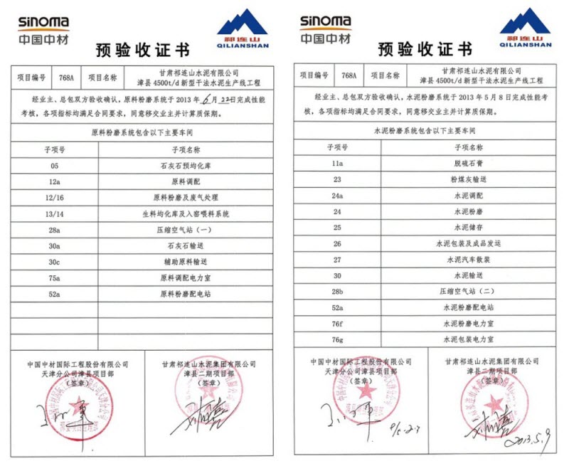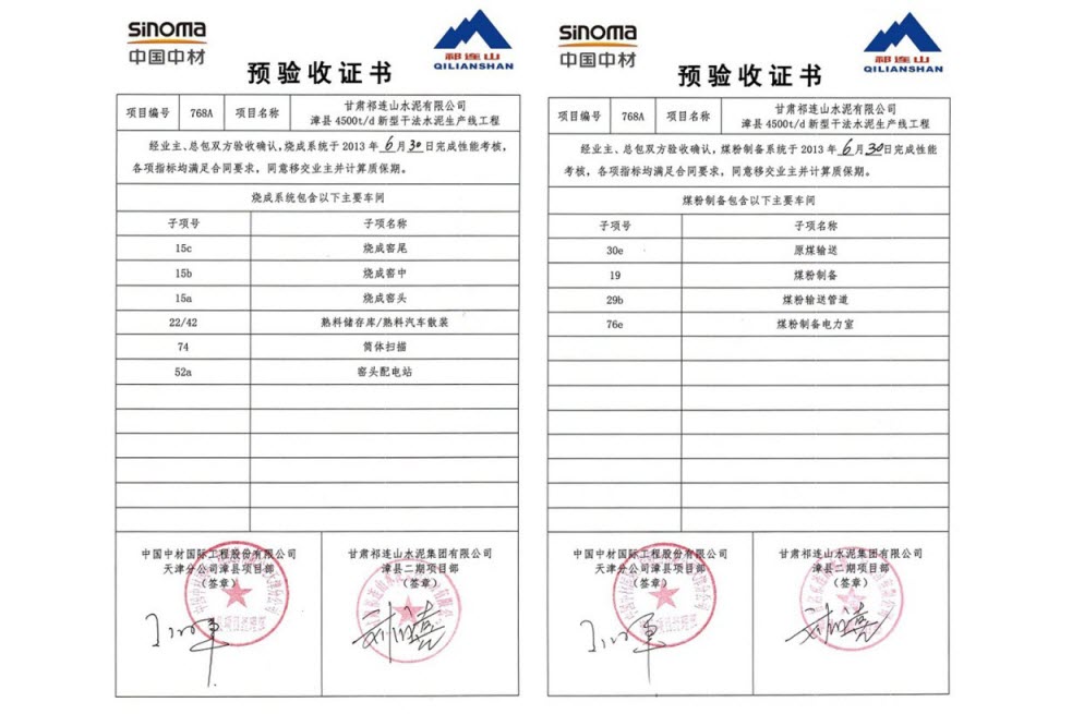 6月30日16:30,由中材國(guó)際天津公司承建的祁連山漳縣項(xiàng)目的窯系統(tǒng)完成了72小時(shí)的連續(xù)運(yùn)行考核,經(jīng)業(yè)主、總包雙方確認(rèn),所有考核指標(biāo)均滿足合同要求,考核取得圓滿成功。同時(shí),業(yè)主將燒成系統(tǒng)的預(yù)驗(yàn)收證書頒發(fā)給項(xiàng)目經(jīng)理王海軍。至此,漳縣項(xiàng)目整條生產(chǎn)線的PAC全部完成,投入正式生產(chǎn)。