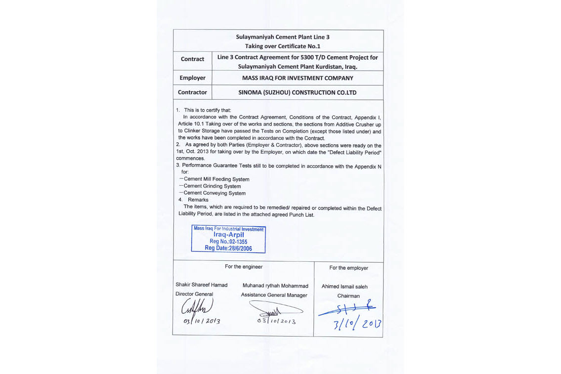 2013年6月15日,中材國(guó)際南京蘇州公司承建的伊拉克SCP2號(hào)線獲得業(yè)主簽發(fā)的FAC證書(Final Acceptance Certificate—最終接收證書)。