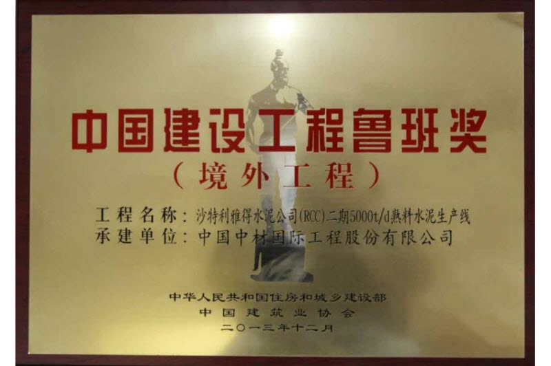 2013年12月5日,中國建設工程魯班獎表彰大會在北京舉行,中材國際EPC總包建設的“沙特利雅得水泥公司(RCC)二期5000t/d熟料水泥生產線工程”榮獲2012~2013年度中國建設工程魯班獎(境外工程)。此次共有229項國內外工程獲得魯班獎,其中境外工程僅27項。