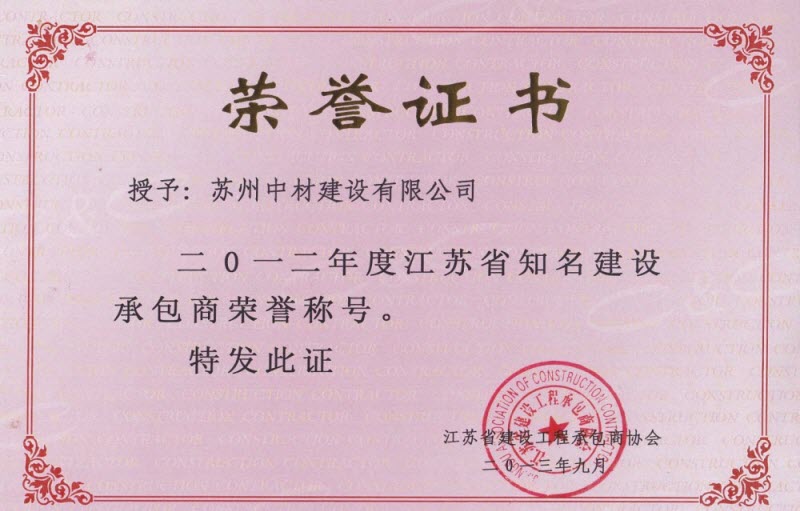 2013年12月19日,江蘇省住房城鄉(xiāng)建設(shè)廳在南京召開了全省建筑業(yè)海外工作會(huì)議,會(huì)議表彰了2012年度“江蘇省知名承包商”及“江蘇省境外建設(shè)工程優(yōu)秀項(xiàng)目經(jīng)理”。蘇州中材建設(shè)有限公司獲得“江蘇省知名承包商”的榮譽(yù),這是公司第8次榮獲該項(xiàng)殊榮。