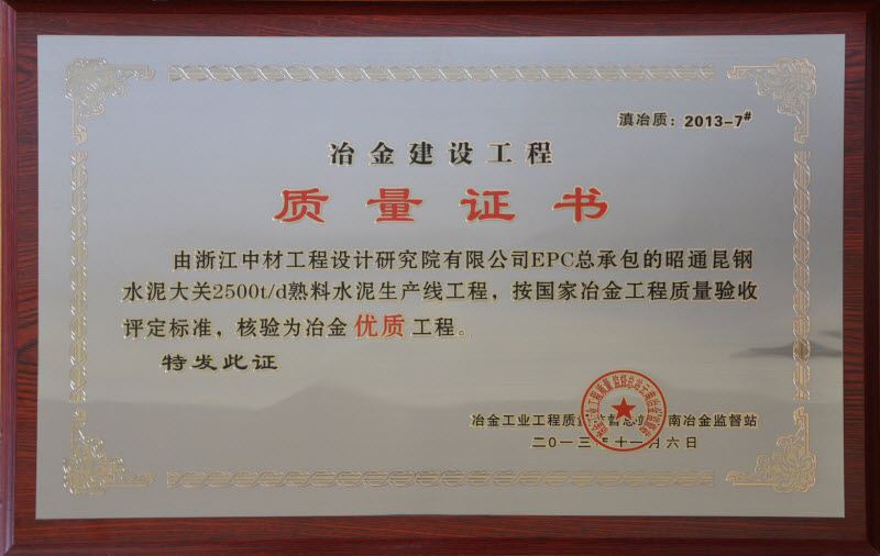 近日,由浙江中材EPC總承包的昭通昆鋼水泥大關(guān)2500t/d熟料水泥生產(chǎn)線工程,按照國(guó)家冶金工程質(zhì)量驗(yàn)收評(píng)定標(biāo)準(zhǔn),核驗(yàn)為冶金優(yōu)質(zhì)工程。冶金工業(yè)工程質(zhì)量監(jiān)督總站云南冶金監(jiān)督站向浙江中材頒發(fā)了冶金建設(shè)工程優(yōu)質(zhì)工程的質(zhì)量證書。