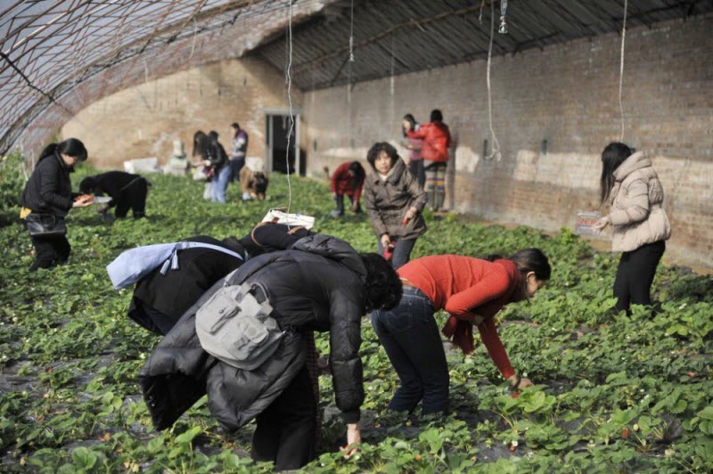 草莓的種植結(jié)構(gòu)是一垅一垅的,很整齊,為了利于生長(zhǎng)還布上了一層薄膜。細(xì)細(xì)的草莓葉莖頂上分布著一朵朵黃蕊白花,紅寶石一樣的成熟草莓和尚未成熟的綠色草莓寶寶密密地掛在草莓苗上,很是玲瓏可愛。