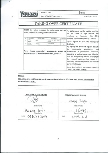 3月8日,Intercement水泥公司巴拉圭Tupi項(xiàng)目經(jīng)理Ruben Lobo先生與公司巴拉圭Tupi項(xiàng)目經(jīng)理張北國(guó)先生共同簽定了該項(xiàng)目水泥粉磨發(fā)運(yùn)系統(tǒng)接受證書(shū),標(biāo)志著該系統(tǒng)施工、安裝、調(diào)試工作圓滿結(jié)束并正式進(jìn)入一年質(zhì)保期。得益于公司領(lǐng)導(dǎo)英明的決策、各部門(mén)各單位團(tuán)結(jié)緊密的工作、現(xiàn)場(chǎng)項(xiàng)目部科學(xué)的安排和掌控,試運(yùn)行期間,水泥粉磨系統(tǒng)各項(xiàng)參數(shù)都明顯優(yōu)于合同性能保證條款中各項(xiàng)參數(shù)界定,性能卓越,達(dá)到國(guó)際國(guó)內(nèi)同類型水泥粉磨系統(tǒng)一流水平。