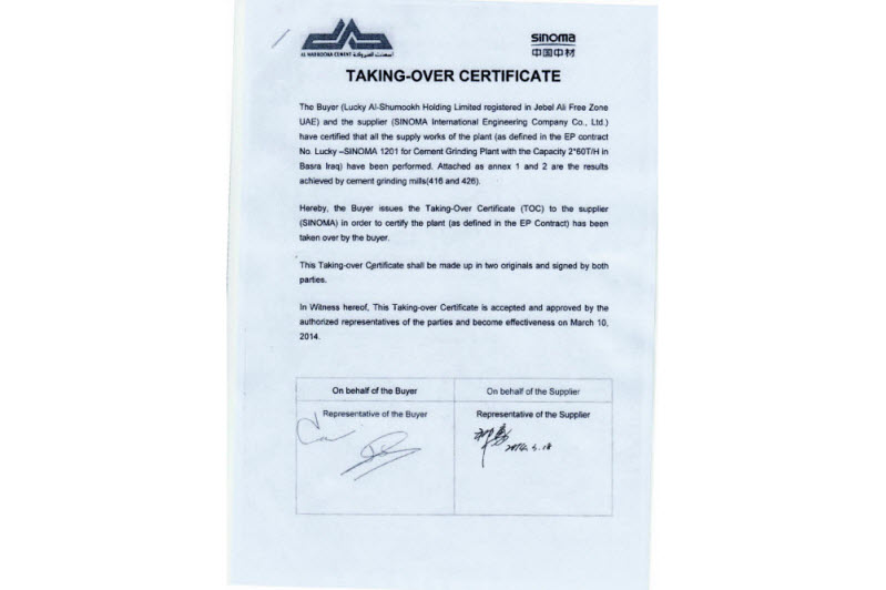 3月15日,由中材國際天津公司承建的伊拉克2*60T/H水泥粉磨站生產(chǎn)線獲得了業(yè)主簽發(fā)的臨時驗收證書,標志著整個項目順利通過業(yè)主驗收,并全面移交業(yè)主。項目正式進入一年質(zhì)保期。