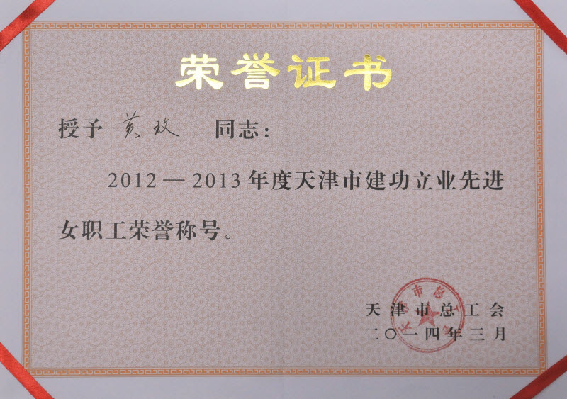 日前,天津市總工會(huì)召開了天津市女職工建功立業(yè)先進(jìn)座談會(huì),并網(wǎng)發(fā)了《天津市總工會(huì)關(guān)于表彰2012—2013年度天津市“建功立業(yè)先進(jìn)女職工”、“女職工建功立業(yè)示范崗”、“女職工建功立業(yè)優(yōu)秀組織單位”的決定》(津工發(fā)〔2014〕7號(hào)),對(duì)天津市建功立業(yè)先進(jìn)女職工給予了表彰,中材裝備集團(tuán)散料技術(shù)裝備研究所黃玫同志被授予“2012-2013年度天津市建功立業(yè)先進(jìn)女職工”榮譽(yù)稱號(hào)。