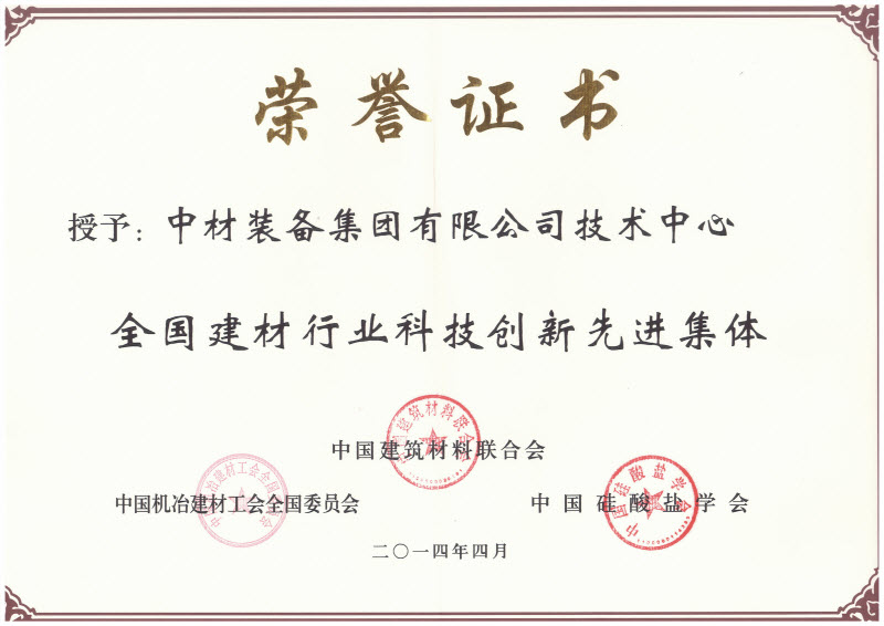中材裝備集團技術(shù)中心榮獲“全國建材行業(yè)科技創(chuàng)新先進集體”稱號,裝備集團總工程師狄東仁、技術(shù)總監(jiān)柴星騰,粉體公司總工程師劉子河榮獲“全國建材行業(yè)優(yōu)秀科技工作者”稱號。