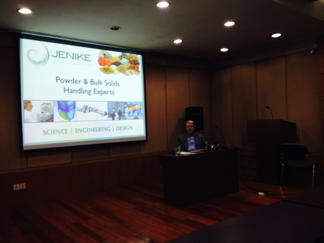 交流活動(dòng)由天津公司工藝所戴恒杰主持?;顒?dòng)開始后,天津公司總工程師俞為民首先對(duì)John先生的到來表示熱烈歡迎。隨后,John先生對(duì)JENIKE公司的歷史和其粉狀及散狀物料處理技術(shù)在工程領(lǐng)域的應(yīng)用實(shí)例進(jìn)行了簡(jiǎn)要介紹,其悠久歷史以及在全球范圍內(nèi)的影響力給大家留下深刻影響。John先生還通過簡(jiǎn)單的試驗(yàn)器皿生動(dòng)形象地演示了不同顆粒物料卸料離析和不同角度卸料下物料流動(dòng)形式的不同,結(jié)合正在合作的海德堡項(xiàng)目調(diào)配倉以及轉(zhuǎn)運(yùn)站溜子的設(shè)計(jì),講解了該項(xiàng)目粉狀及散狀物料處理的過程。此外,John先生還詳細(xì)介紹了他們的工作流程:首先是對(duì)各種類型原材料的取樣和收集,然后對(duì)物料的各種物性參數(shù)進(jìn)行實(shí)驗(yàn)室測(cè)試,接下來通過物理或者計(jì)算機(jī)模擬建立模型,最后通過模型指導(dǎo)設(shè)計(jì)。
