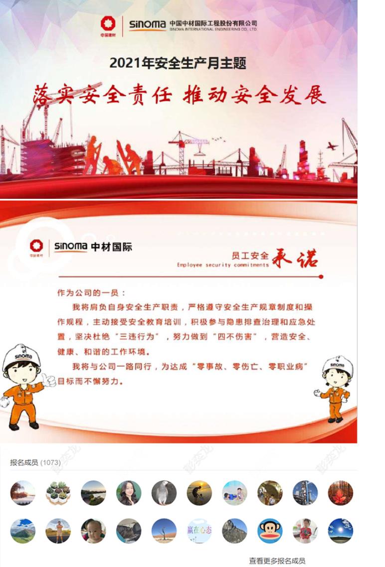隨后,安全環(huán)保部在網(wǎng)上發(fā)布“2021年“安全生產(chǎn)月”的主題,并發(fā)起“中材國際員工安全承諾”活動(dòng)。
