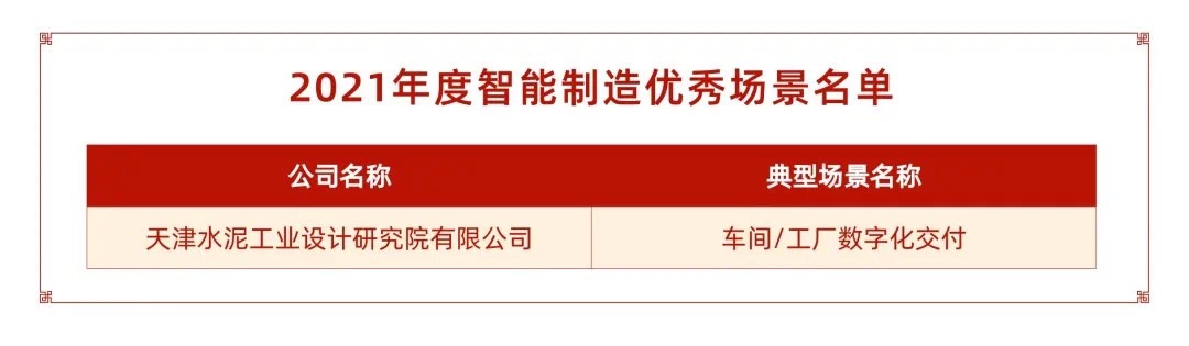 近日,國家工業(yè)和信息化部 國家發(fā)展和改革委員會 財政部 國家市場監(jiān)督管理總局公布了“2021年度智能制造試點(diǎn)示范工廠揭榜單位和優(yōu)秀場景名單”,天津水泥工業(yè)設(shè)計研究院有限公司自主研發(fā)的“車間/工廠數(shù)字化交付”上榜2021年度智能制造優(yōu)秀場景名單。
